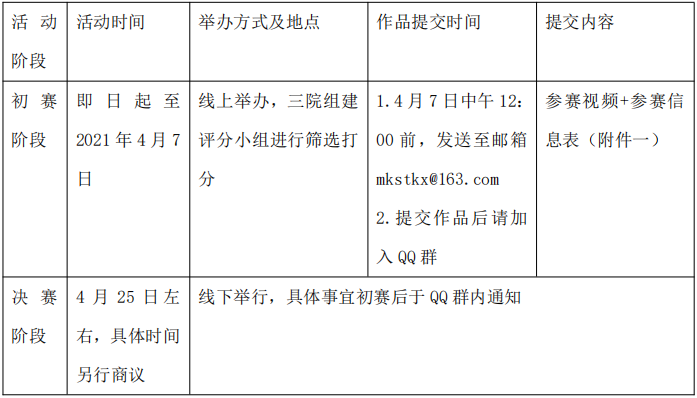 选手以个人为单位,自行录制初赛视频(5分钟内为宜,大小不超过200M),并将初赛视频+参赛信息表(附件一《山东大学“百年故事”马克思主义理论脱口秀大赛初赛信息表》)于2021年4月7日12:00前压缩打包发送至邮箱mkstkx@163.com,文件及邮件名称均为“学院+年级班级+姓名”,并及时加入参赛交流QQ群495977601,以便及时收到后续通知。