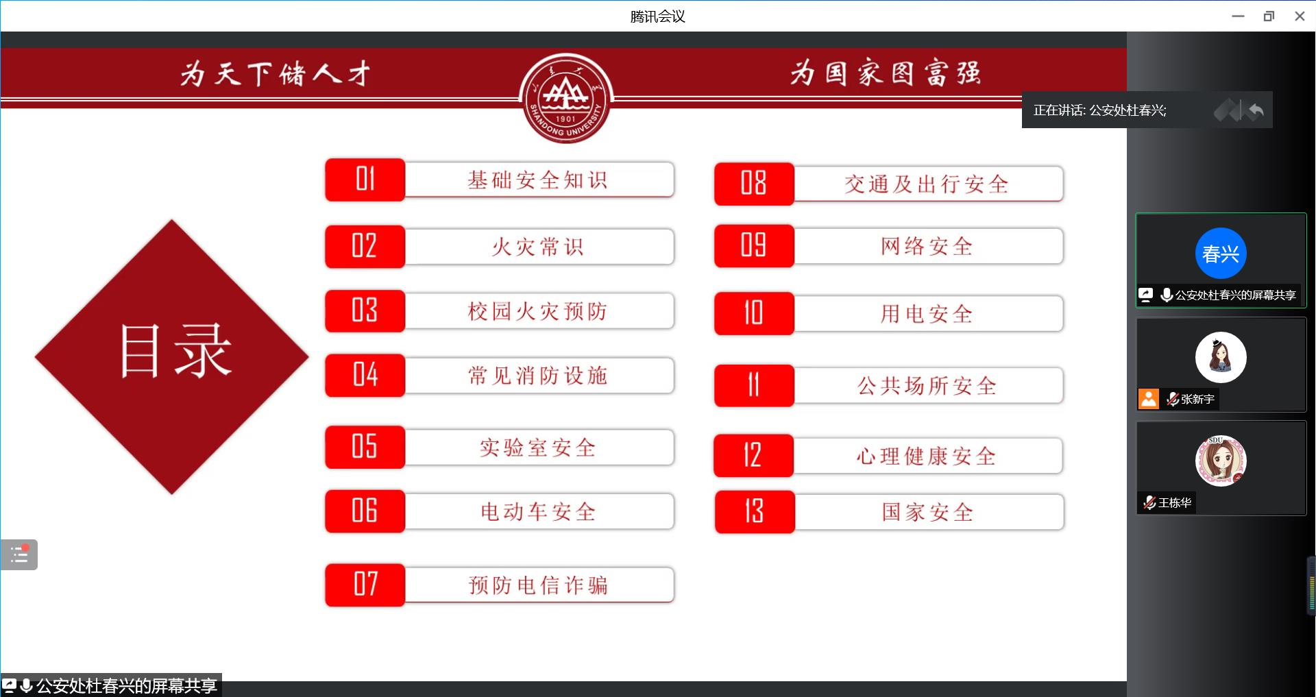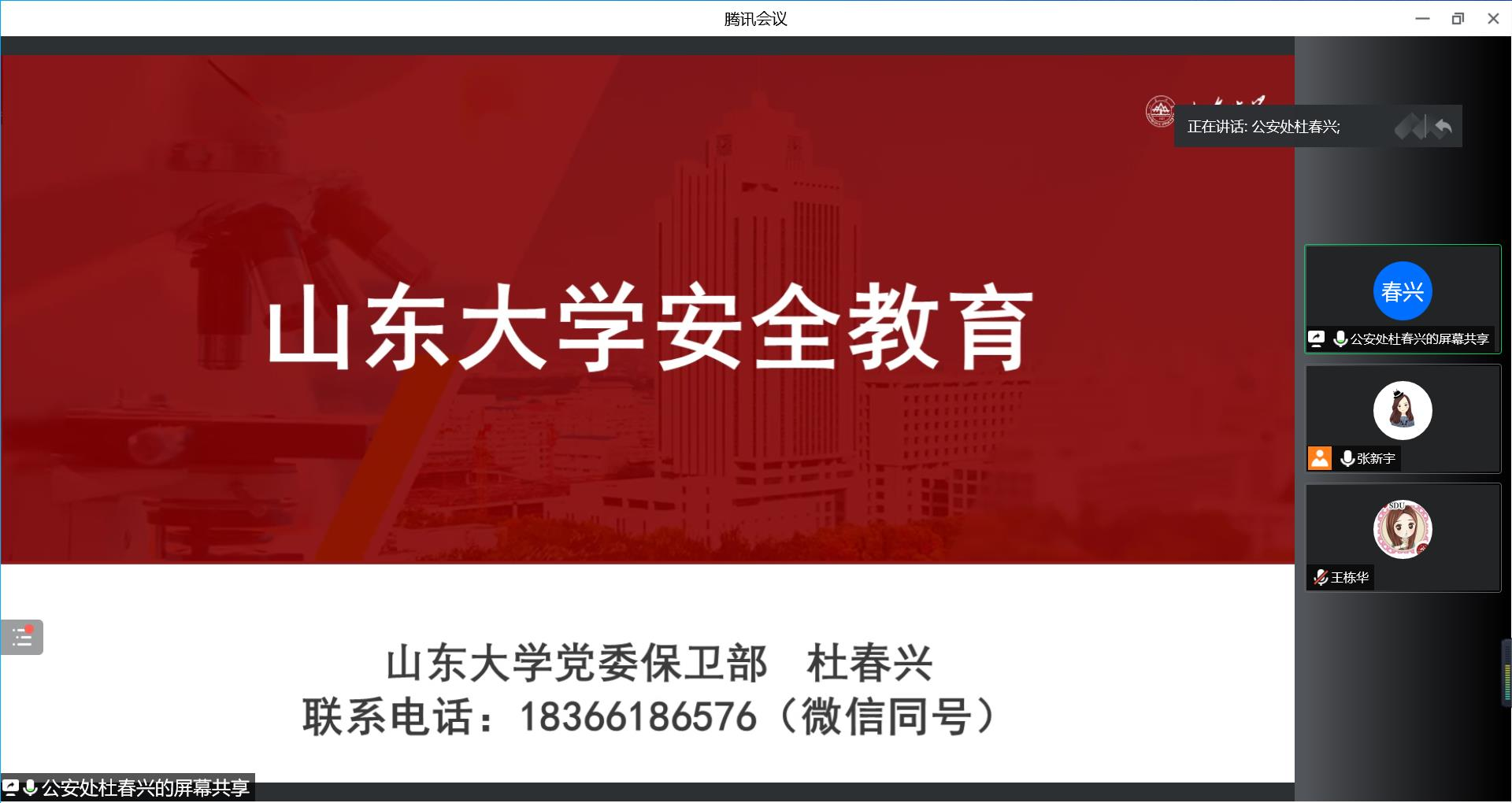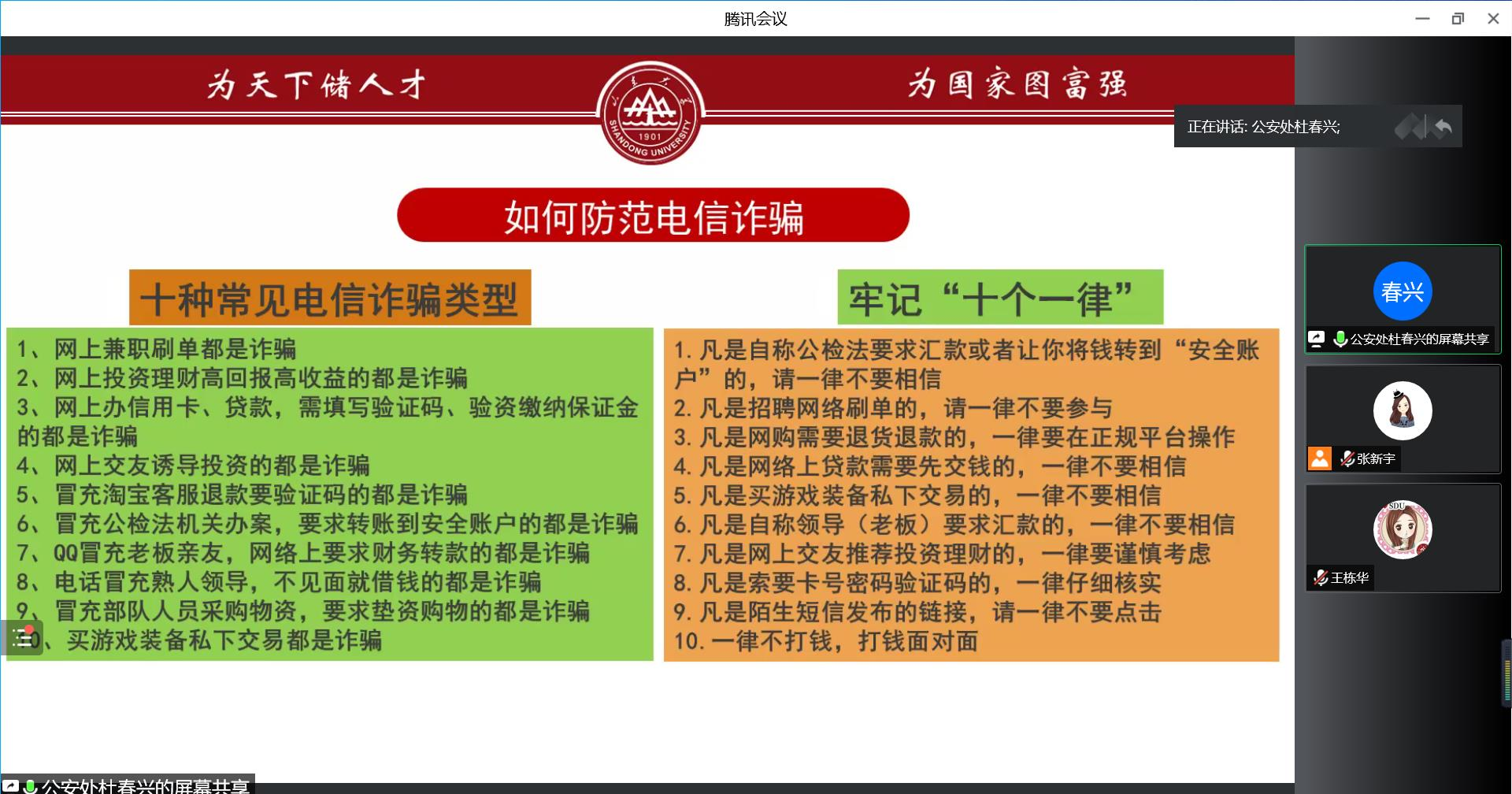 为进一步提升本科生和研究生的安全素养和自我保护能力,根据学校相关要求,山东大学管理学院组织开展了2022级新生入学教育的第二场讲座——安全教育讲座。9月7日下午,安全教育讲座通过腾讯会议线上展开,由山东大学党委保卫部杜春兴老师主讲。院本科生新生辅导员张新宇老师和院研究生新生辅导员王栋华老师主持会议。
