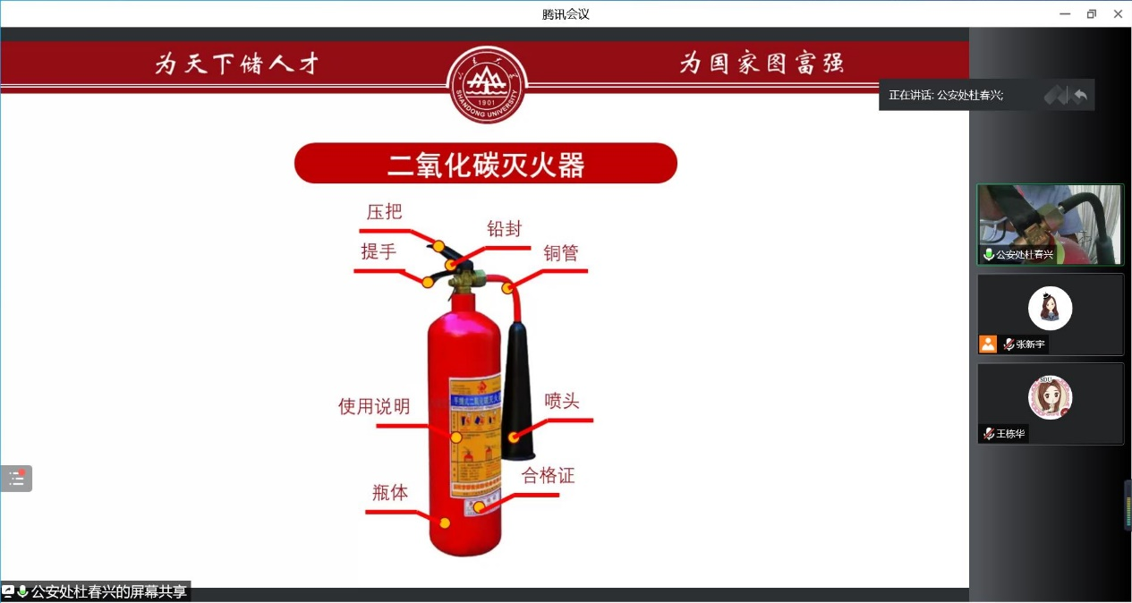 杜春兴对于校园火灾的预防进行了重点强调。火灾是指在时间和空间上失去控制的燃烧造成的灾害。火灾的发生需要可燃物、助燃物和着火源,因此相对应的,可以通过控制可燃物、减少助燃物和降低着火点来灭火。此外,杜春兴讲授了正确拨打火灾报警电话的方法以及火场逃生方法,对常见的消防设施进行介绍,并打开摄像头演示灭火器的使用步骤。