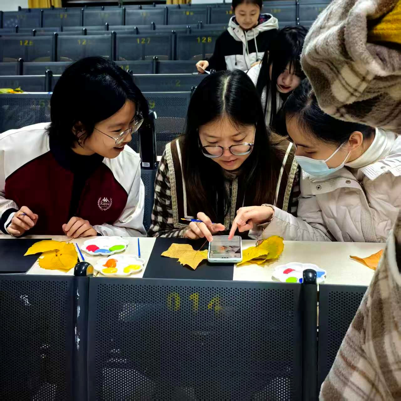创作过程中,同学们不时相互交流技巧、分享灵感。有的同学搭配暖橙与明黄颜料,还原秋日生机;有的同学尝试渐变晕染,打造独特艺术效果;还有同学结伴合作,将多片树叶组合拓印,勾勒出创意十足的图案。同学们在艺术的创作中疗愈心灵,每一幅拓印作品都承载着同学们对秋天的热爱与对生活的美好期许。