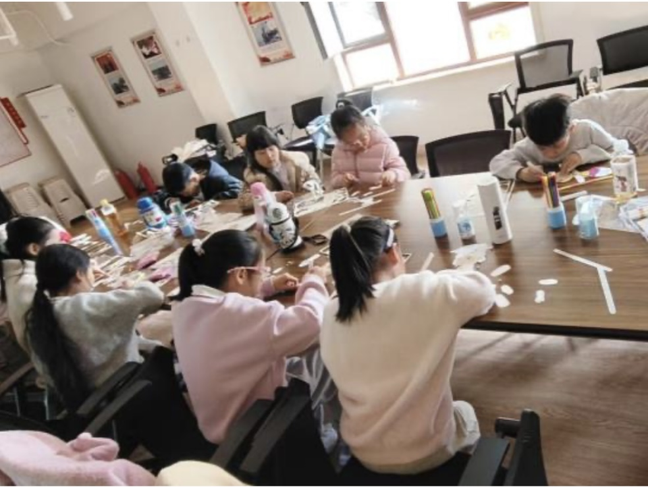 2月,实践队将调研成果落地基层,走进龙信社区开展两场“薪传工坊”特色文化课堂。2月2日的传统折纸课堂,以破冰互动、历史讲解、技艺教学为核心,将吉祥文化融入教学,指导青少年动手创作,让传统文化在趣味互动中实现代际传递;2月24日的老济南非遗皮影课堂,先开展非遗科普,讲解济南皮影戏历史与特色,再带领孩子们制作简易皮影,从勾勒轮廓到安装关节全程指导,让孩子们在亲手创作中感受非遗魅力,让文化传承的种子在童心生根。