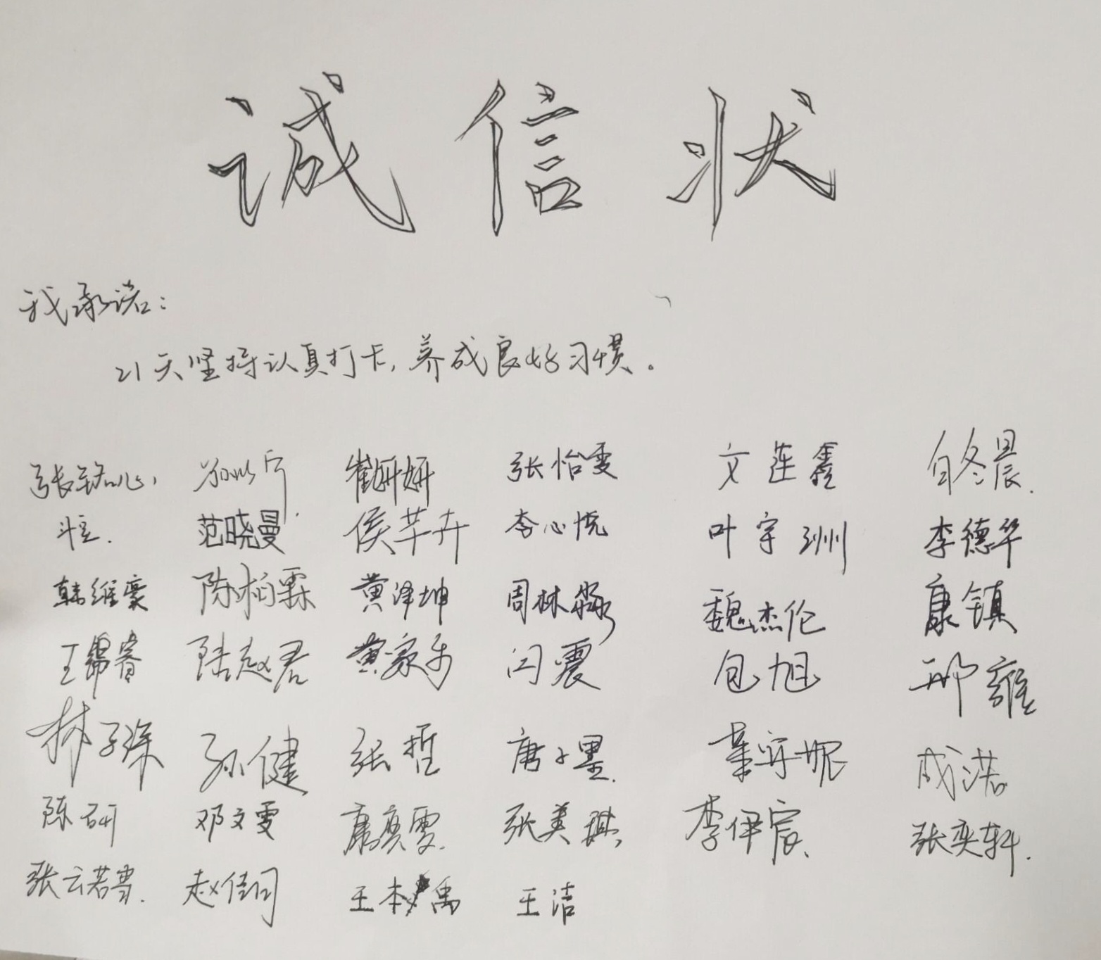 此次启动仪式旨在响应管理学院“诚信状”活动,促进班级内部优良学风的建设和培养学生个人素质。启动仪式开始,张怡雯介绍班级诚信状必选项活动——“学习爱我,我爱学习”,即班级同学自发结为学习小组,每周完成一定量的自习次数与时长,并用学习软件记录凭证。此项活动有利于营造良好的班级学习氛围,督促同学有效学习。随后,张怡雯介绍班级特色诚信状活动——“莫忘远方的爱与思念”,即每周与父母线上联系,记录沟通日常与感受。此项活动针对现在多数大学生离开父母独立生活的社会现实,有利于增进同学们对父母的关心与理解。两项活动均由班委协商和班级同学投票选定,是班级文化的体现。会议最后,全体同学在诚信状上签名,保证积极参与此次诚信状活动
