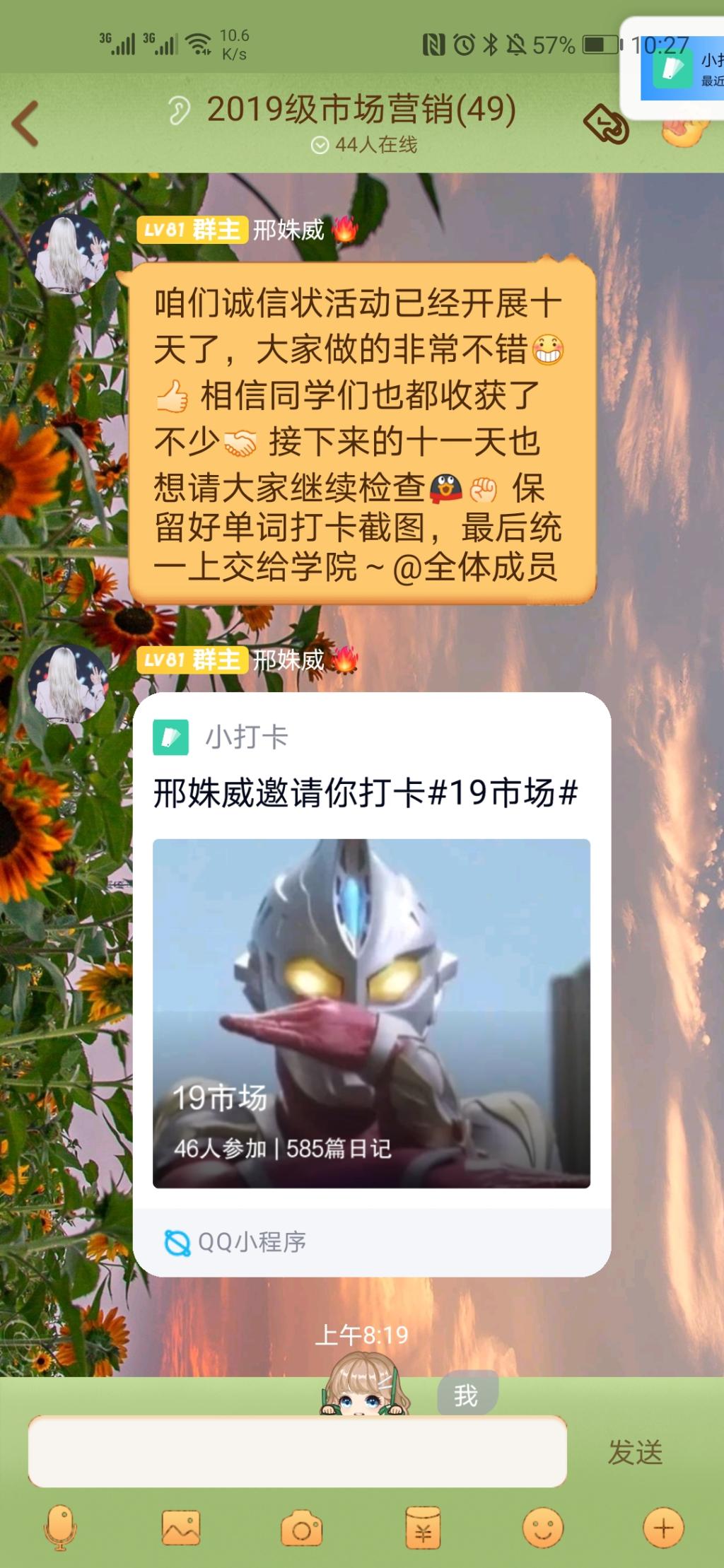 12月11日,19级市场营销专业在线上召开了21天“诚信状”活动的中期总结。此次总结由班长邢姝威主持,19级市场营销专业全体同学参加。