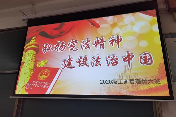 12月10日,2020级工商管理类专业6班举行国家宪法日主题教育班会。本次班会由组织委员项天颖和宣传委员赵凤锦主持,班级全体同学参加。