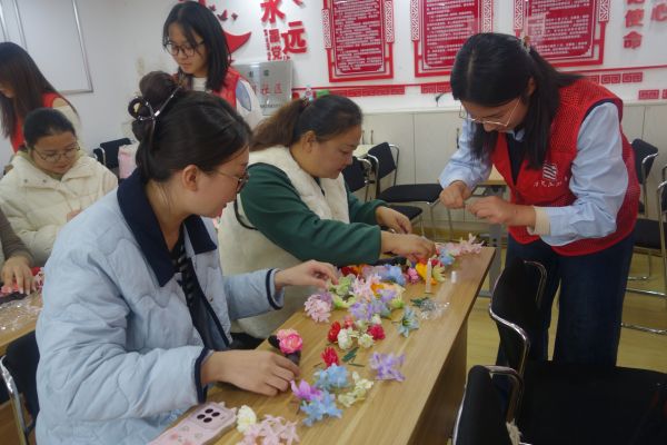 随后的手工制作环节中,志愿者们耐心指导居民制作簪花发箍。大家在基础样式上尽情发挥创意,巧妙搭配色彩与造型。一朵朵别致精美的簪花在居民手中绽放。志愿者们穿梭其间,悉心协助,现场氛围温馨而活跃,充满了创造的乐趣。