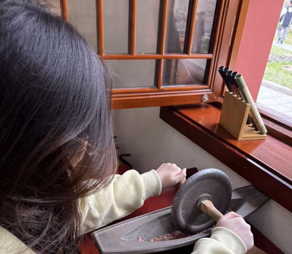 午间,师生们在寺内茶舍体验了素面斋饭,通过饮食文化感受寺院生活的宁静简朴。下午的自由调研阶段,同学们分组考察了文创中心,亲身体验手工香囊制作,积极与NPC互动,深入了解灵岩寺在文化创意产品开发和游客体验优化方面的创新实践。