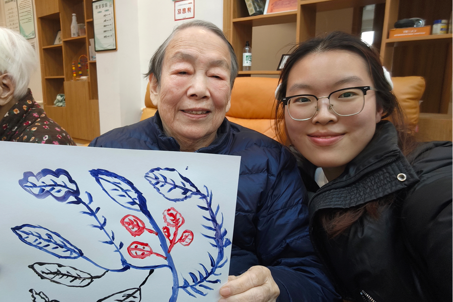 我们的志愿活动内容主要是引导老人们画画,陪伴他们聊天。初见时,苏奶奶温婉地推脱说不会画画。可画笔在手,她立刻变得专注而笃定。那双微颤的手勾勒出细致的叶脉,几乎不需我在旁边指导,一幅很有水墨画意境的作品便在她笔下自然流淌。完成后,她拉着我激动地说:“没想到八十岁还能画出这样的画,你是我的小老师。”那笑容里,满是完成创举的满足。
