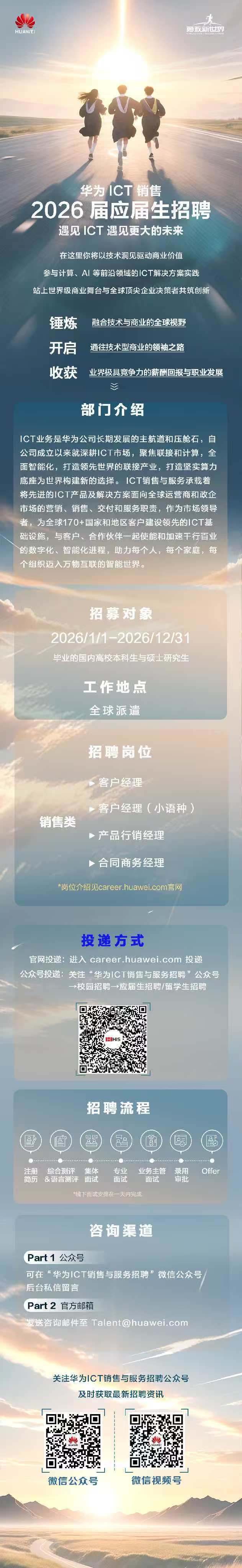 ●公众号投递:关注“华为ICT销售与服务招聘”公众号获取最新资讯与投递入口